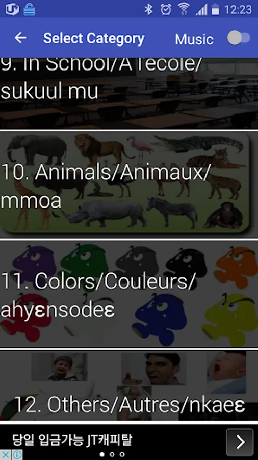 The Setting option allows you to change the background of the application, or to choose the sequential mode. Sequential mode allows you to browse the terms exactly as they are in the database. This mode is particularly useful when learning numbers.