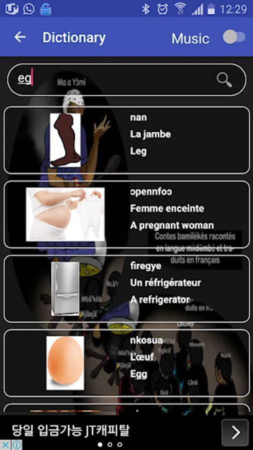 -In The dictionary mode, you can search for a word in English, French, or Twi language. You can also use the clafrica code to search using the General alphabet of African Language based on International Phonetic Alphabet (IPA). You can find this code on www.resulam.com