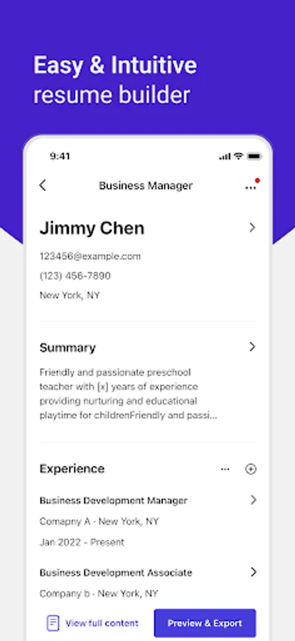Looking for a resume builder or resume maker? This resume builder app is not only free to download, your resume is free to export. Personalize your resume for employers, showcasing your skills in any industry. Our resume templates will help you, and our resume builder team is always available if you have questions.