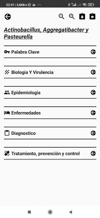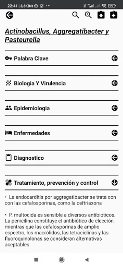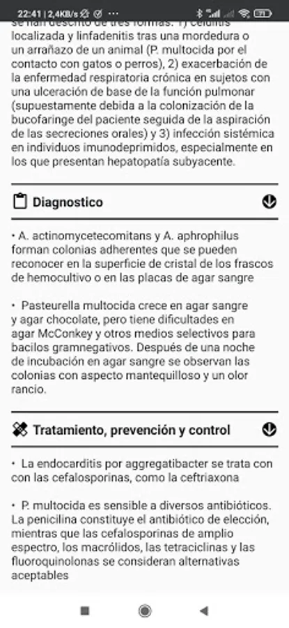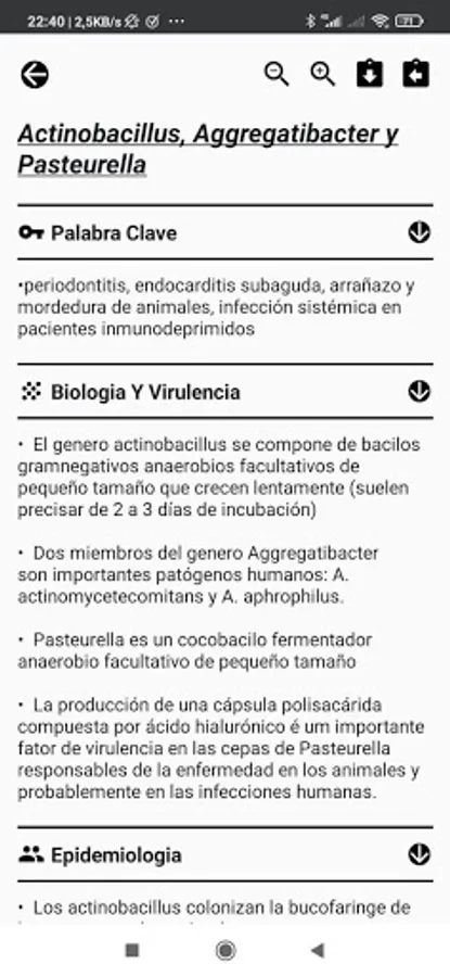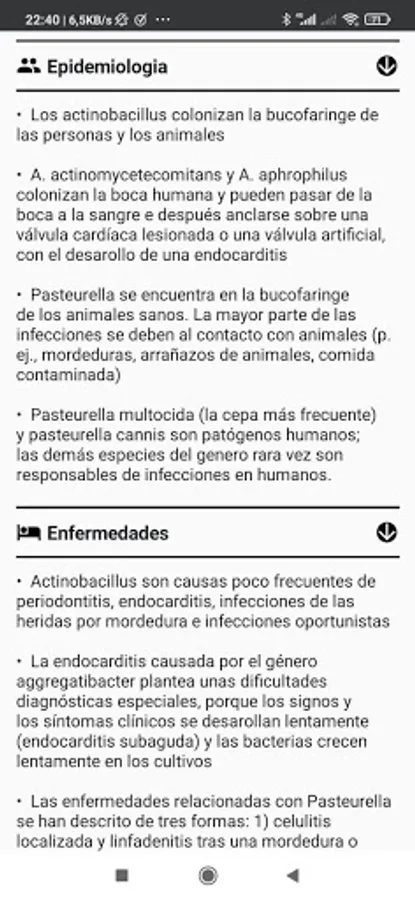 In this application, you will easily find all the bacteria from Murray, Rosenthal and Pfaller's 8th edition of Medical Microbiology book. The application allows you to search for the names of bacteria, look at the epidemiology, disease, diagnosis, keywords and treatment, prevention and control. It is possible to change the language to Brazilian Portuguese or Spanish. The application has no interaction with the images, however, its content is completely reliable following the book as a basis. The intention of our application is to bring the best and most reliable content for: students, doctors and all those who work in the health area. For your convenience, the application allows you to enlarge the font and close or open the content of the titles.