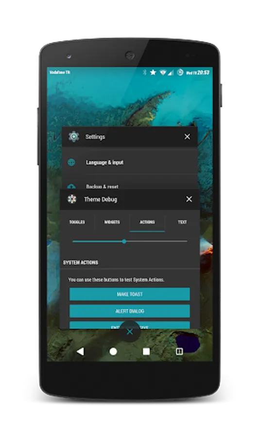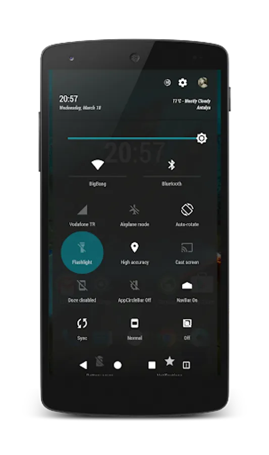 Combinations of dark material and dark gray accent cyan primary, secondary and also now transparent notification panel.toggles background, backgrounds are grayed out ..