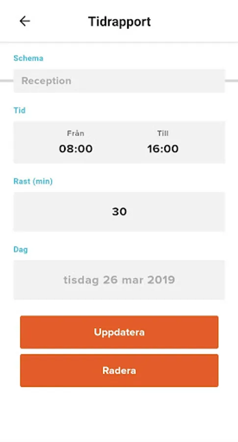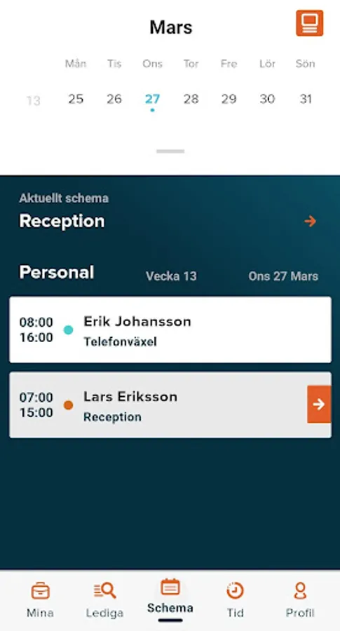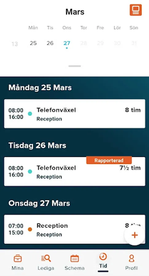 The app is a free complement to our customers who have a schedule program license with us at Resursbokning AB. This app gives you as a customer a quick and clear view of your schedule as well as the possibility of time reporting and stamping.