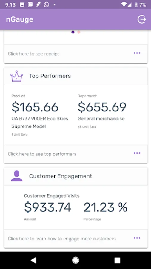 nGuage is retailcloud's dashboard application for Android and Windows that allows a business owner to keep track of key sales metrics such as gross margin, markdown percentages and inventory turnover as well as to view sales transactions, see their top sellers. It even provides you a daily look at how much of your sales need to go back to inventory, to the tax collector, to cover payroll and how much is left over.