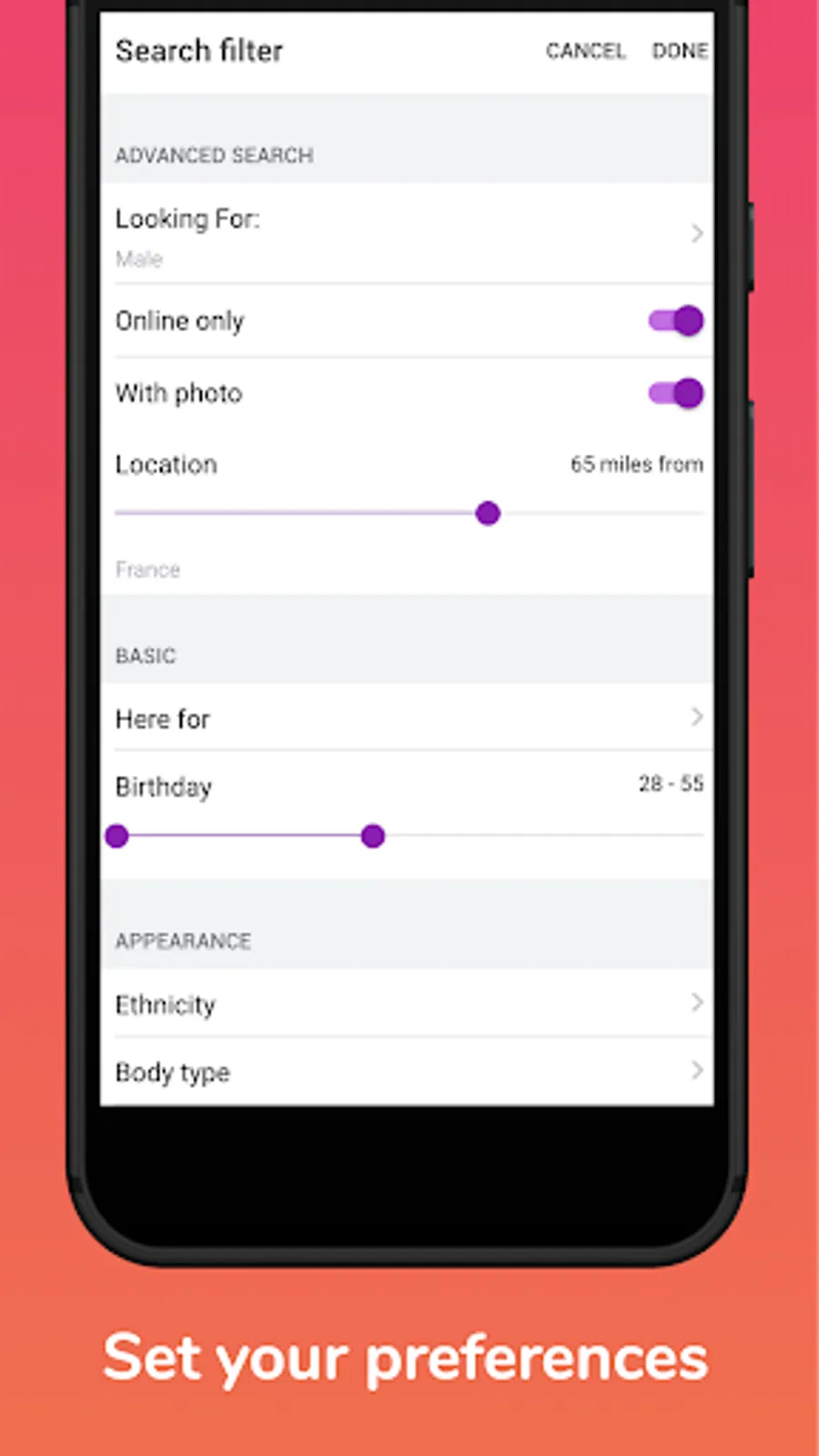 ● Set your preferences, add pictures, add interests & more