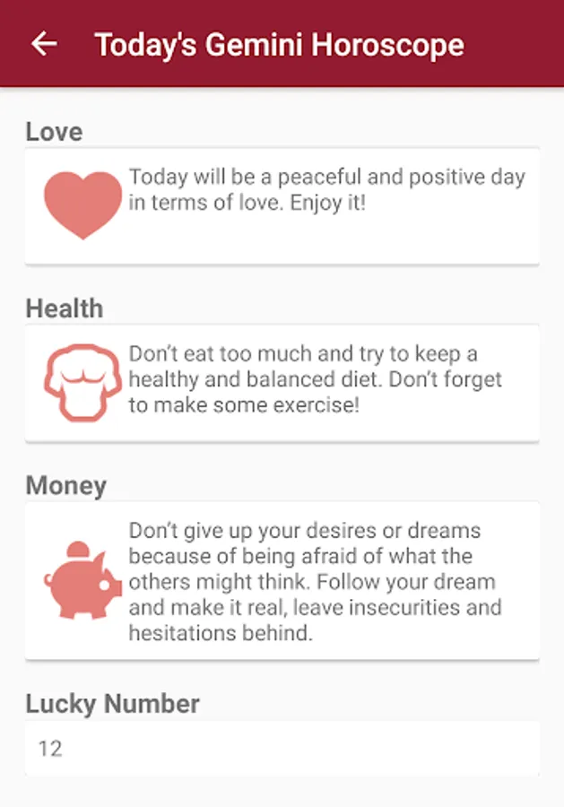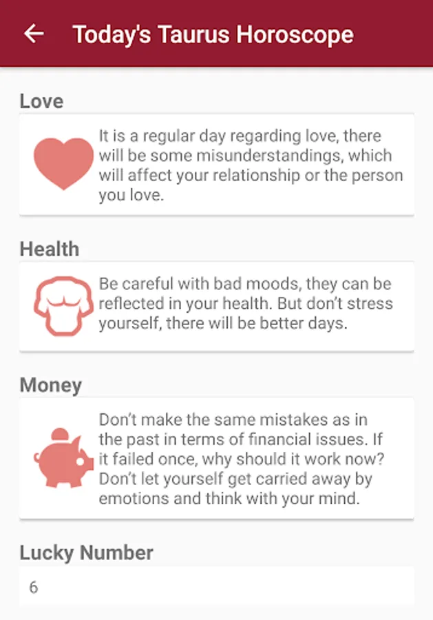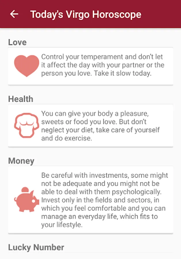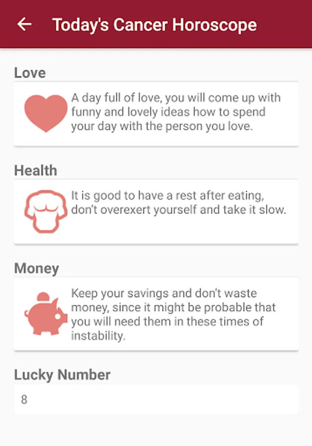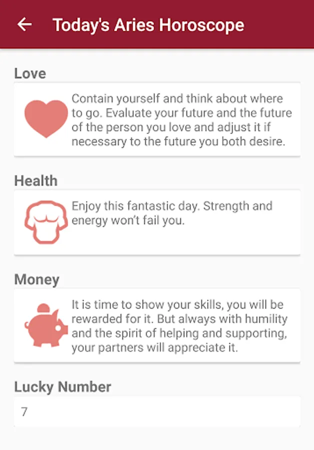 * Clear and concise app: We explain you everything clearly and easily, so that you won’t have any doubts. You can see texts about love horoscope, money horoscope, health, friendship and much more.