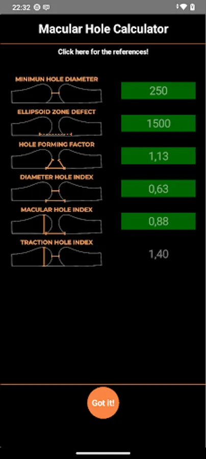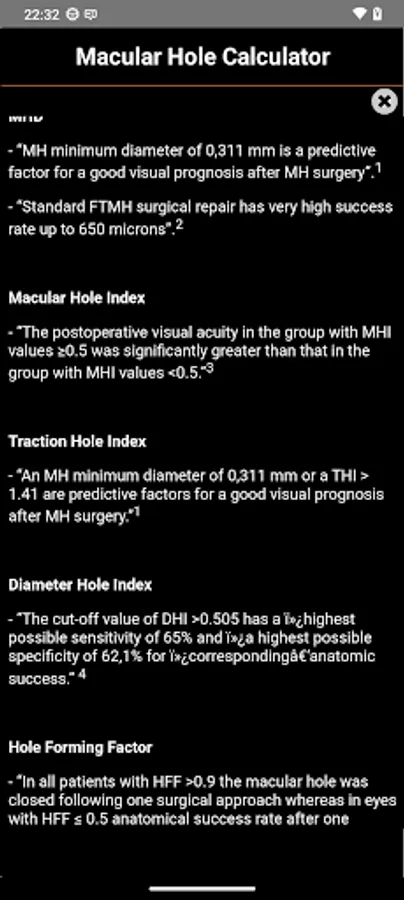This is an application that enables the correlation of preoperative optical coherence tomography (OCT) findings on macular hole (MH) with predictive factors for successful surgery outcomes for retina-vitreous surgeons. This application utilizes specific indices, including Macular Hole Index (MHI), Diameter Hole Index (DHI), and Tractional Hole Index (THI) using quantitative parameters of MH on OCT such as maximum outer diameter, minimum diameter between edges, height, nasal and temporal arm lengths, height, and ellipsoid zone defect, that can define different prognostic results. Overall, it allows for a more accurate prediction of surgical outcomes and enhances the ophthalmologist's ability to provide optimal patient care.
