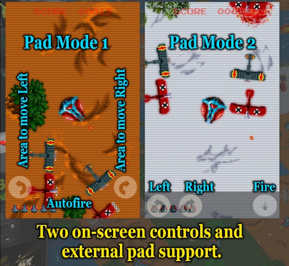 - Two screen pad configurations to control the ship, 1 with autofire and 1 without autofire. With manual fire you can get a slightly higher shoting rate.