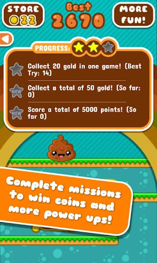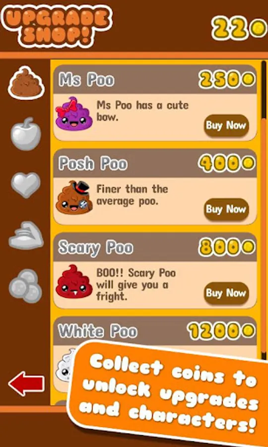 Happy Poo brought friends this time too, you can collect them all by picking up the coins in the game, or you can use your coins to build up Happy Poo's power ups!