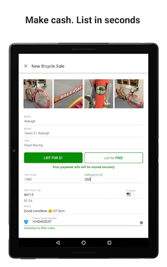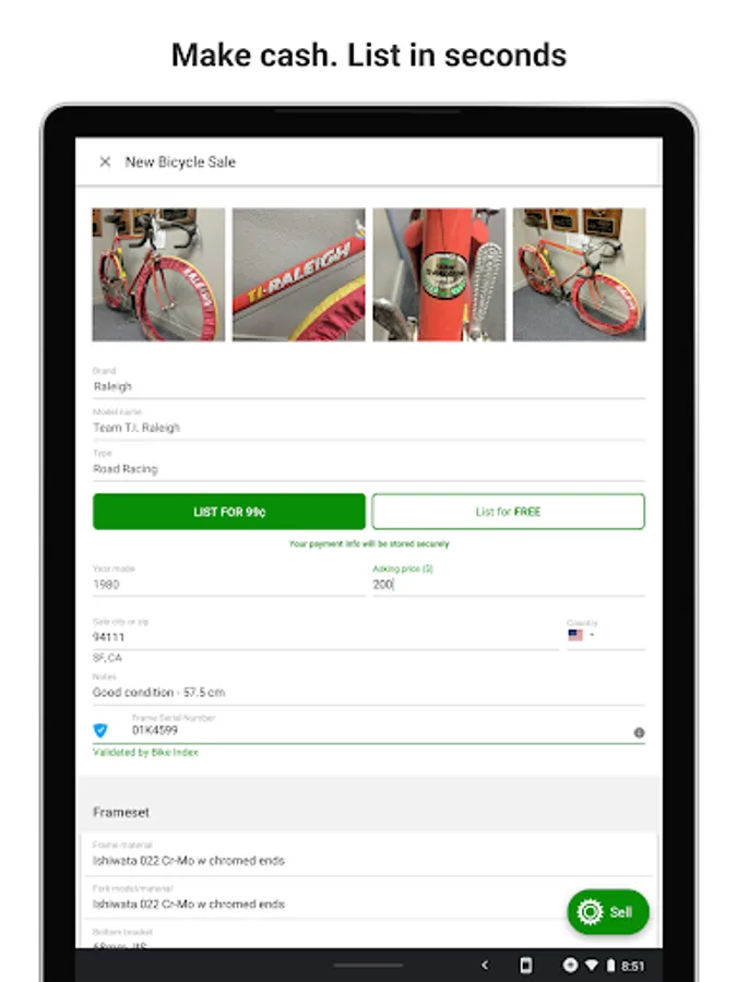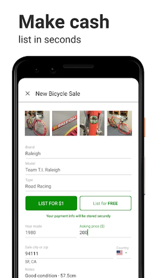 EARN MONEY • Sell your bicycles and parts in under 30 seconds • List your products for only $1(or less in your country) and keep 100% of your earnings • Receive buyer emails and negotiate the best deals • Track your sales in your Sprocket profile and earn community points with each sale
