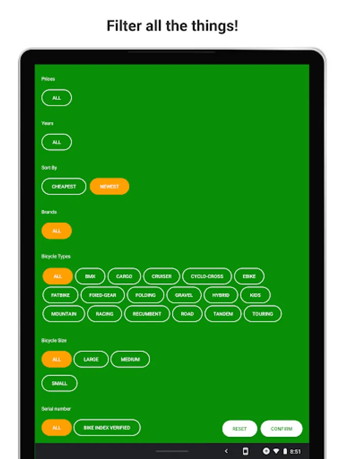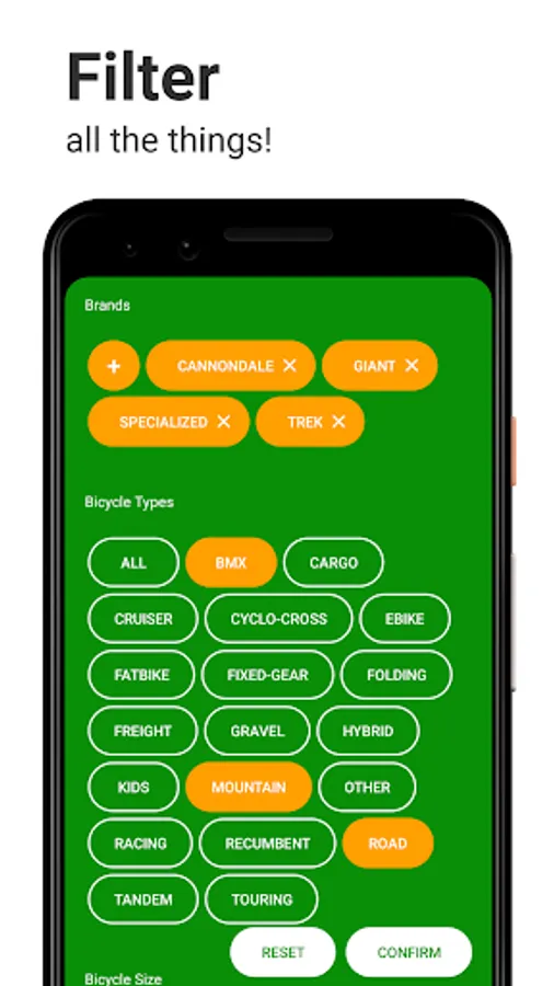 BUY YOUR BICYCLE • Find top-quality bikes and cycling parts for sale from local cyclists • Negotiate the best deals with nearby riders and get great bargains • Filter sales by proximity, price, crypto, production year, brand, size, type and riding style • Road, XC, Mountain, Fixed, BMX, and more - find the perfect fit for your style of riding! • See even more bicycles available form eBay and Amazon!