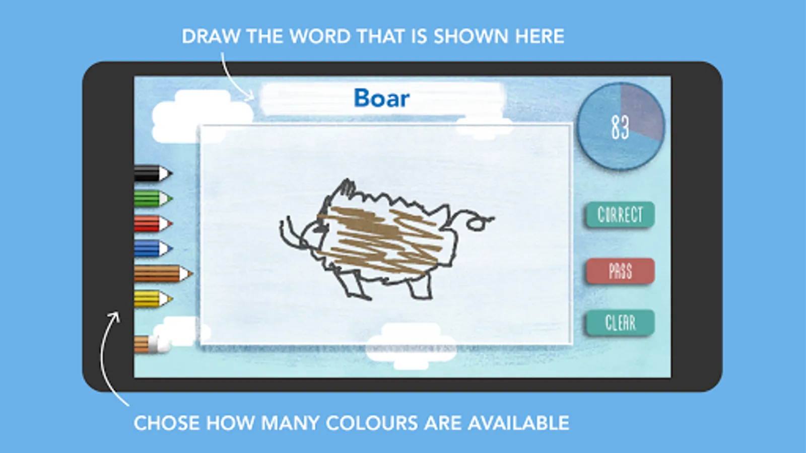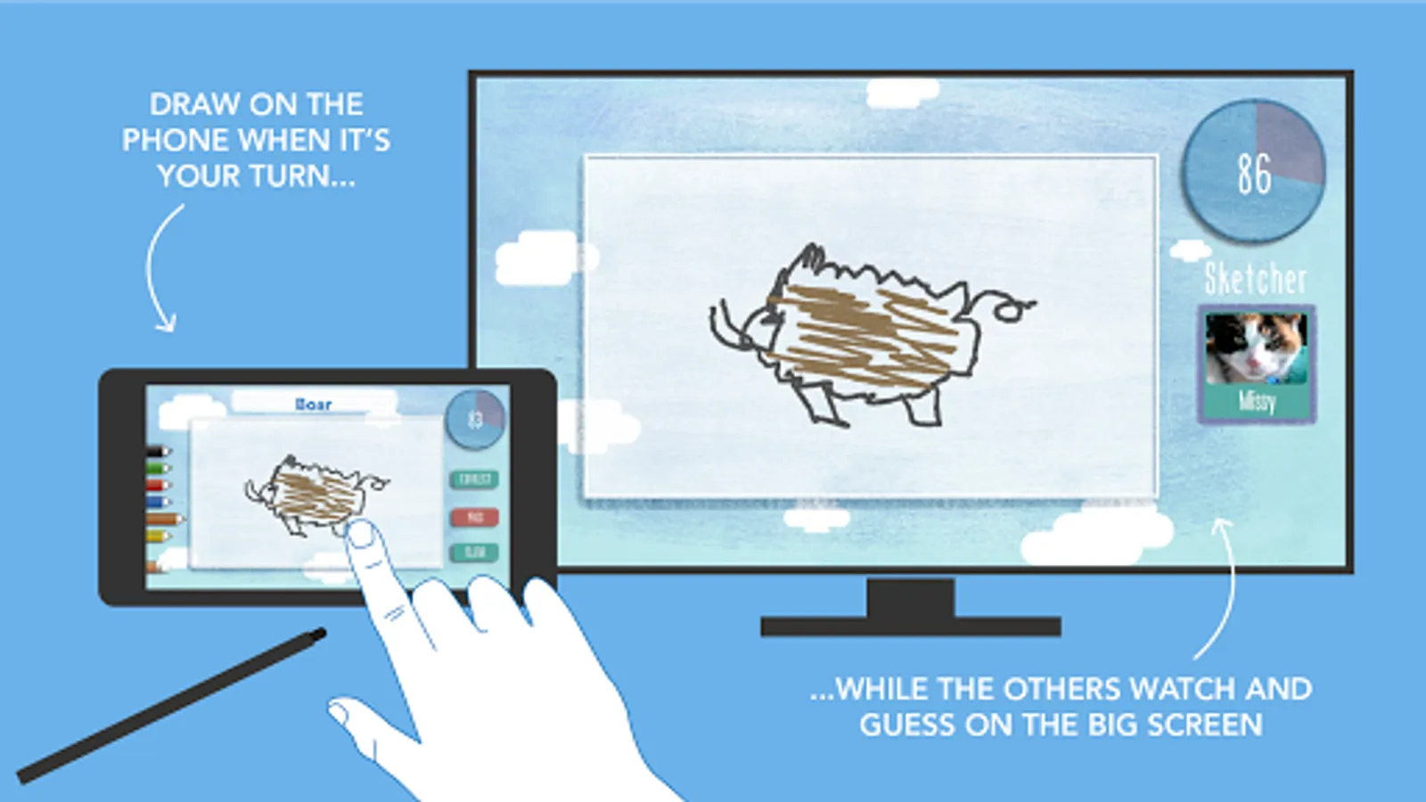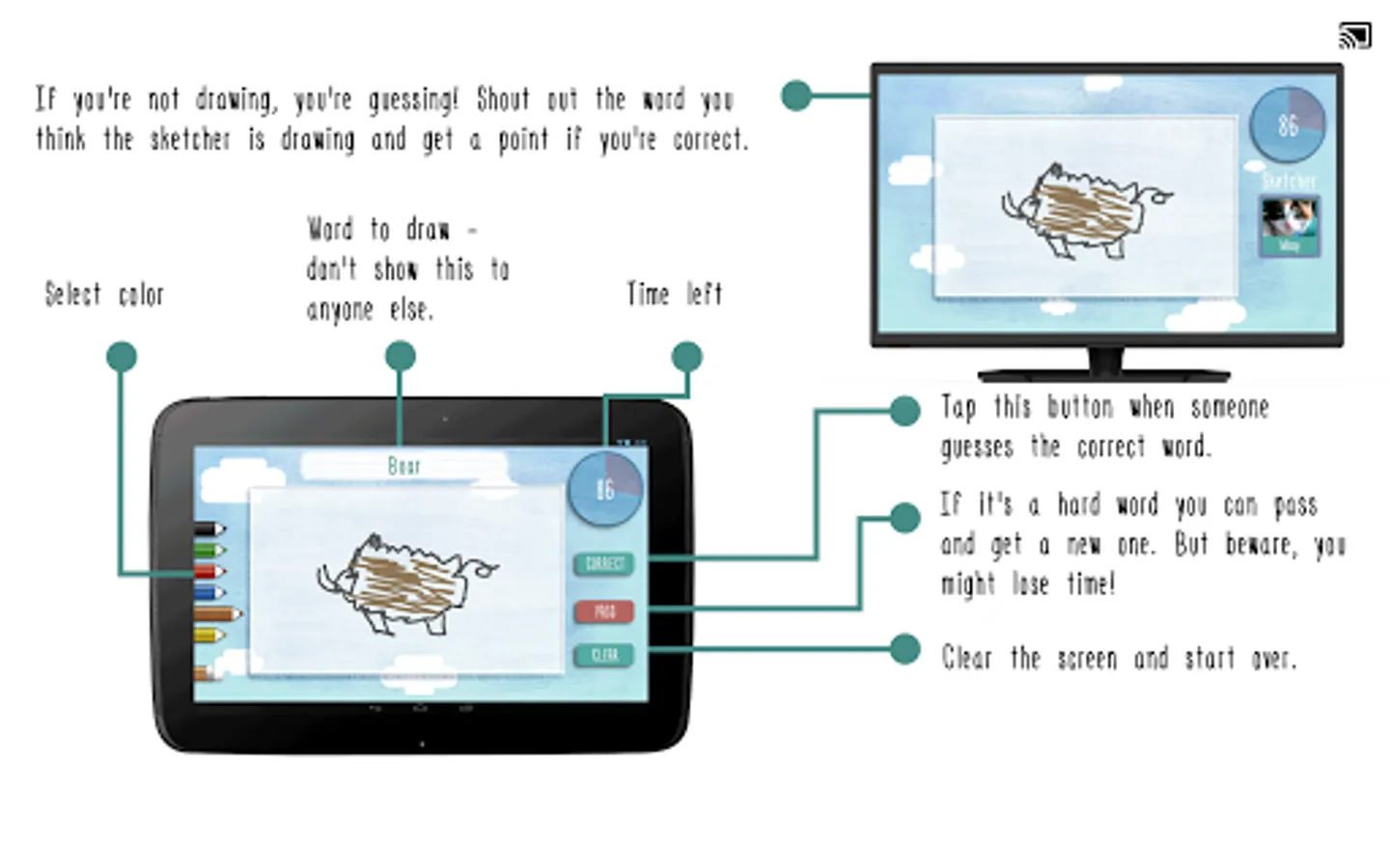 Challenge your friends or family in a game of draw and guess. Take turns and draw the words you see on the Android tablet or phone touchscreen – the image is simultaneously being plotted live on the TV-screen using Google Chromecast – for everyone to guess.