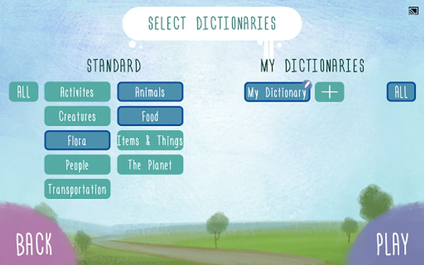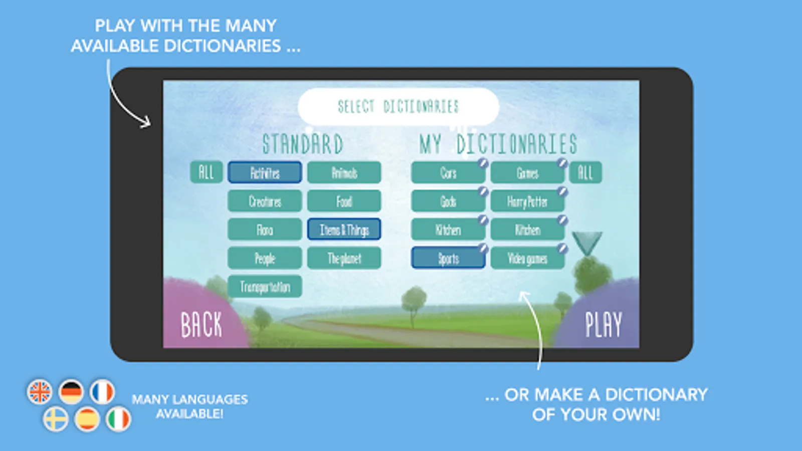 Choose from existing dictionaries, packed with more than 700 words for 6 languages, or get creative and make your own lists. The possibilities are never-ending!