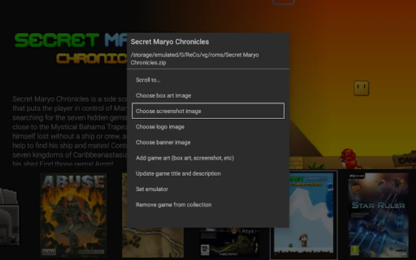 RESET Collection is an emulation frontend that can pull art assets and game info from an online video game database for your retro game collection that you have backed-up as ROMs on your Android device. You can then pick which of the artwork, screenshots, and box art you want to display.
