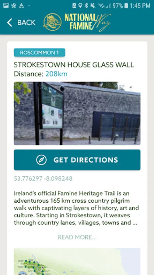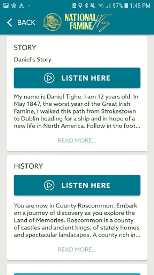 This App is designed to accompany you along the National Famine Way trail. The National Famine Way is a self-guided trail detailing the ill-fated journey of 1,490 famine emigrants who walked from Strokestown Park (home of the National Famine Museum) in Roscommon to ships in Dublin in 1847, at the height of the Irish Famine. Over 30 pairs of bronze shoes are interspersed along the 165km route and each pair of shoes is digitally and physically way-marked. This App will indicated where each pair of shoes are located plus it will provide the walker with:
