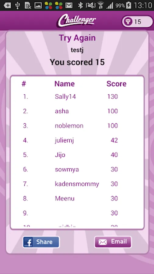 There will be a timer for each question. You can see the final score in the score page. The recently played users score can also be seen in the score page. You can share your score to your friends via email or facebook. Enjoy the quiz and update your knowledge.Cheers!!