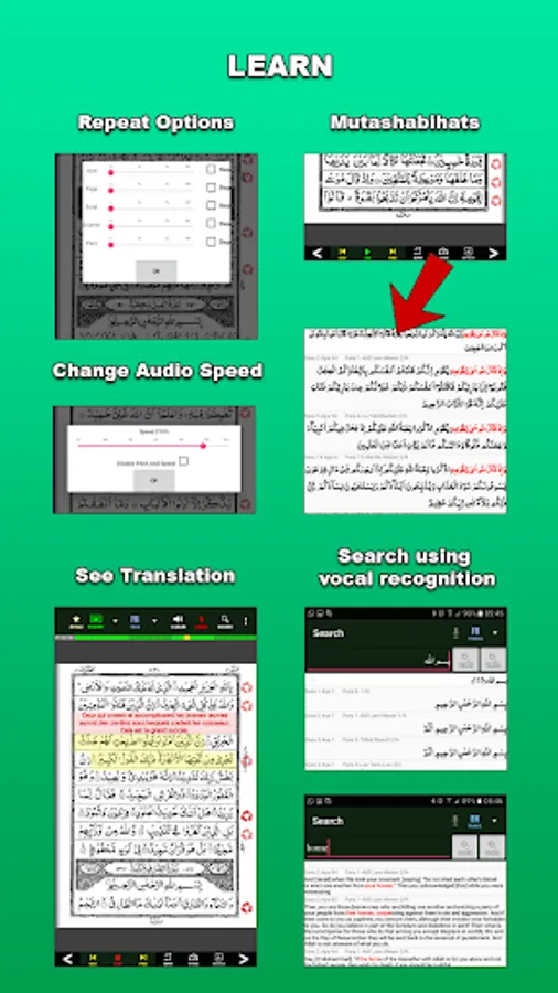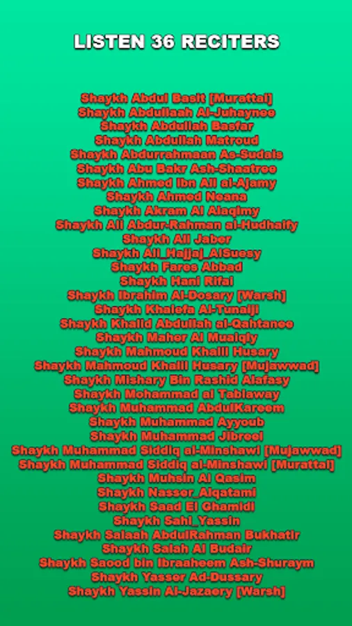 - Listen 36 reciters (Shaykh Ghamidi,Sheikh Alafasy.. ) and change listen speed