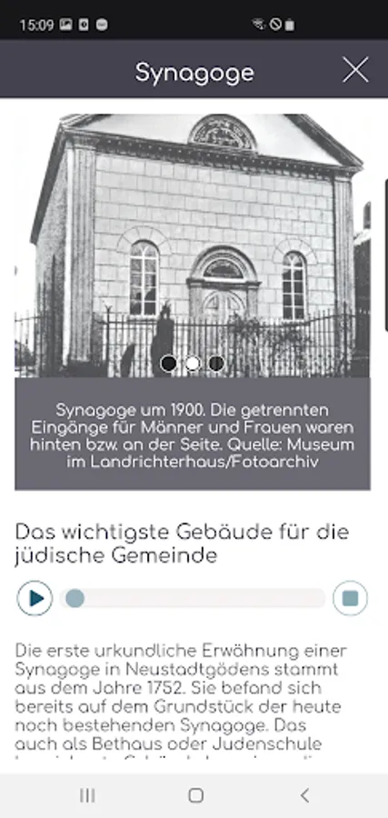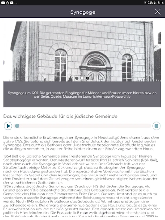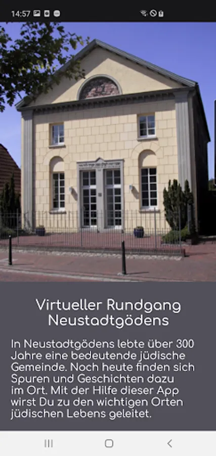 The virtual tour makes the stories hidden behind the buildings and squares accessible to an interested public. Thus, Jewish life can be dealt with in practically all of its facets. There is also interesting information about the castle in Gödens and the grass house in Horsten in the vicinity of Neustadtgödens. A virtual reconstruction of the former synagogue makes an important contribution to the documentation of Jewish life in Neustadtgödens. In addition, two radio plays add to the significance but also the decline of this unique Jewish community.