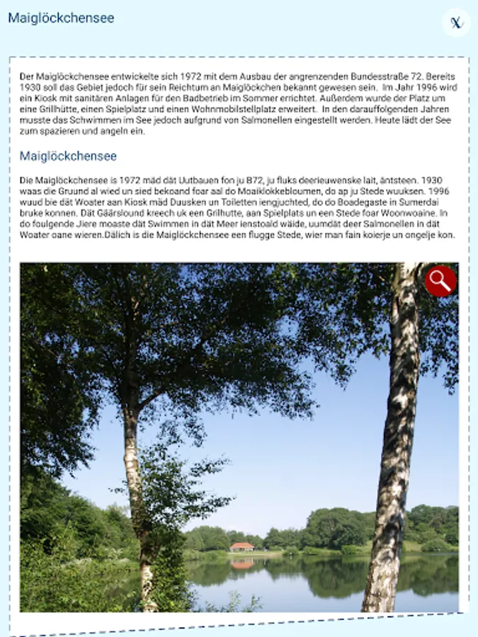 Almost 30 sights of the Saterland are marked out on the map, including information on these points in German and Sater Frisian. There are also pictures and animated short films about the sights specially produced for this app. With the help of this information and the integrated map, users can look at the points they want to visit and get a first glimpse of the fascinating Saterland, the smallest language island in Europe.