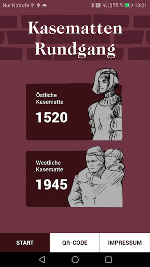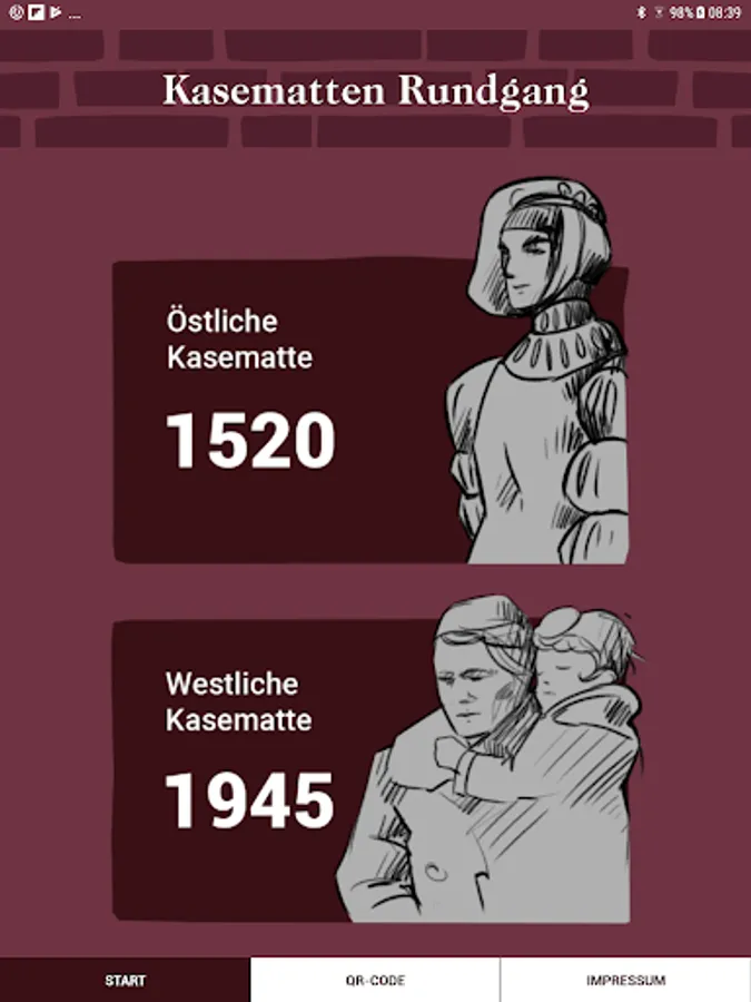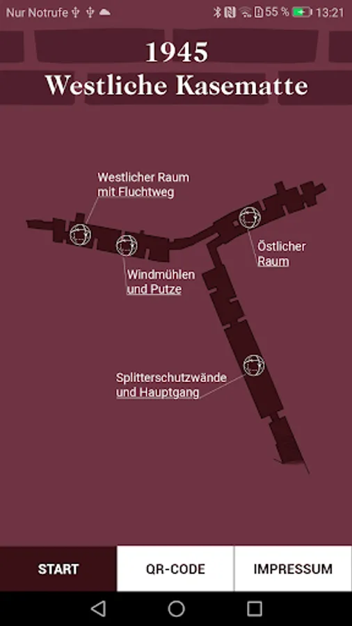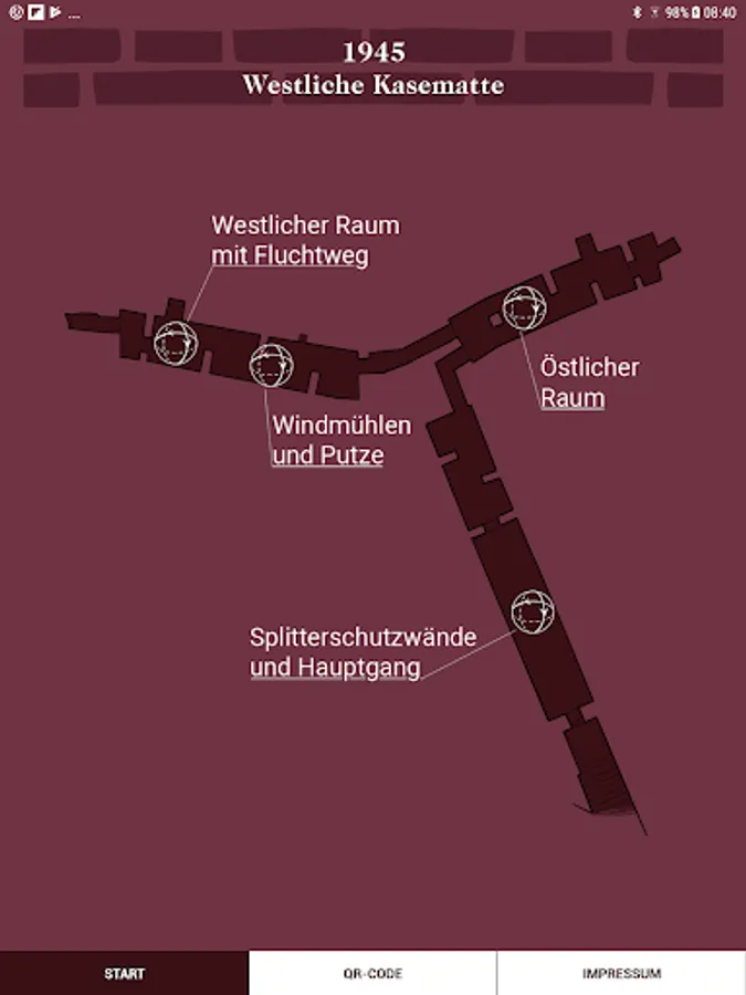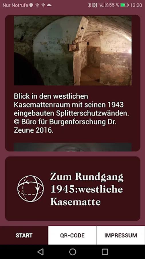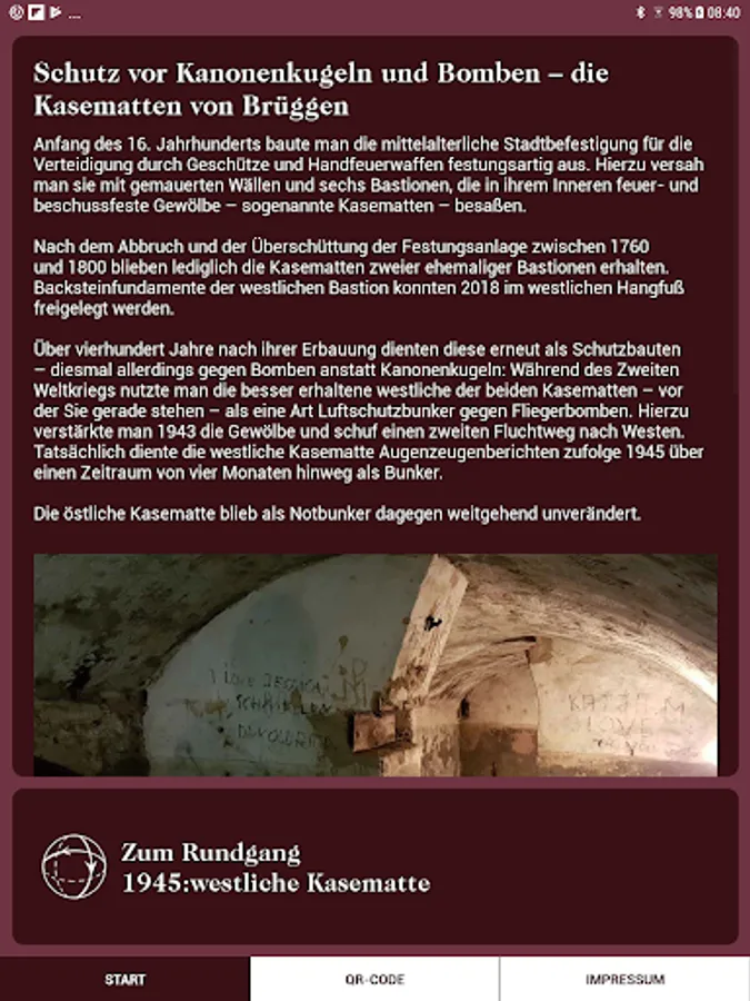 The so-called casemates in Brüggen were built in the 16th century as a defensive fortification and served more than four hundred years after its construction in the Second World War again as a protective structures. The app offers two virtual tours of selected locations through the Eastern Casemate in 1520 and through the Western Casemate in 1945.