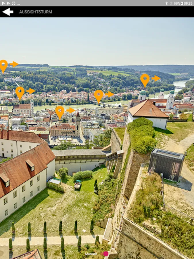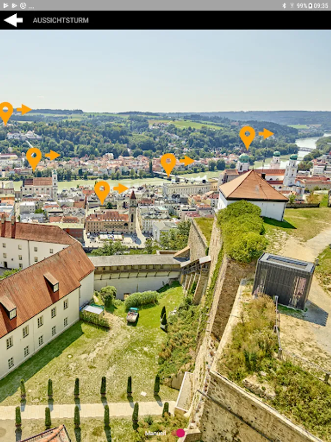 The panorama tour shows the most beautiful viewpoints of the city of Passau, the confluence of the Inn, Danube and Ilz rivers and the impressive view into the Bavarian Forest and beyond the national borders; it also has a special digital attraction: If you look at the city with the app, selected buildings are displayed and explained using augmented reality.