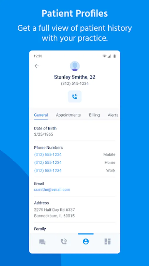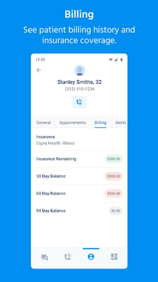 - View patient information including upcoming appointments and outstanding balances