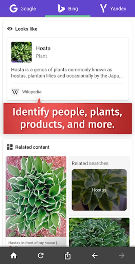 For any image you select, the app constructs a channel to execute a search. The selected image, through the channel built by the app, is passed onto the search engines. When a search engine receives the picture, it will display detailed results pertaining to that picture. This app is not affiliated to any of the search engines featured in it.