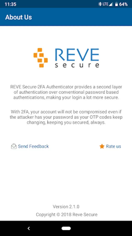 REVE Secure strengthens the security of your login via two-factor authentication (2FA) by means of a unique verification code or OTP (One-Time Passcode), for every login attempt. This app protects all your precious online accounts and sensitive data from the hackers or intruders by adding a second step of verification in the login procedure, called 2FA.