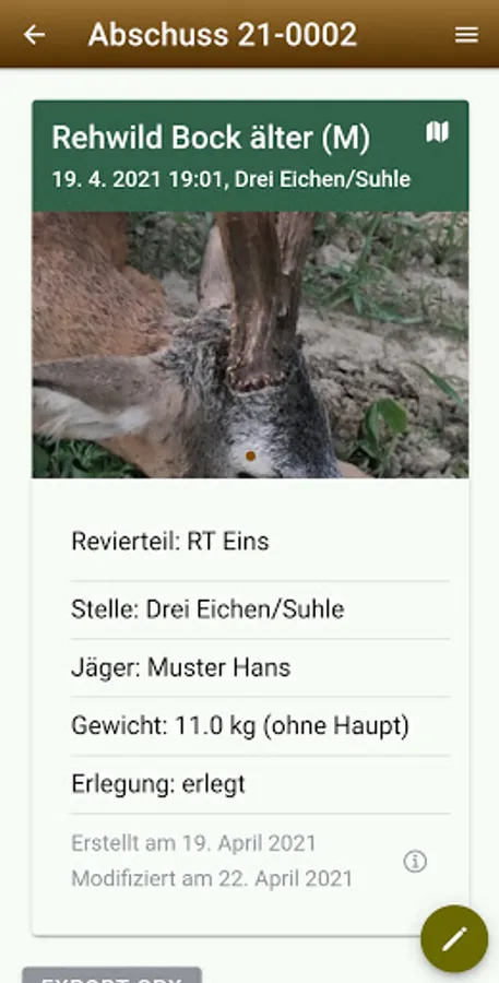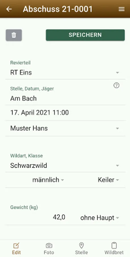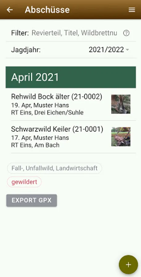 With the free RevierBuch app, you can easily enter kills, hunts, events and locations (each including photo and position) and edit them if necessary, as well as see photos from game cameras, publish your location in the area (check-in in the area) or search for /Send a rescue request via SMS/eMail/App including geoposition. You will receive a notification for new kills/hunting reservations/game camera photos.