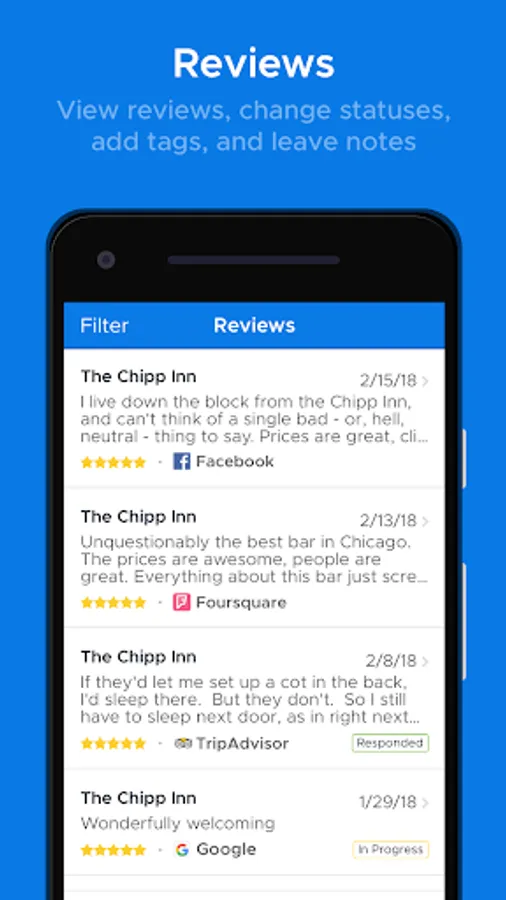 We aggregate your reviews from 100+ different online review sources including Google, Facebook, TripAdvisor and Foursquare.