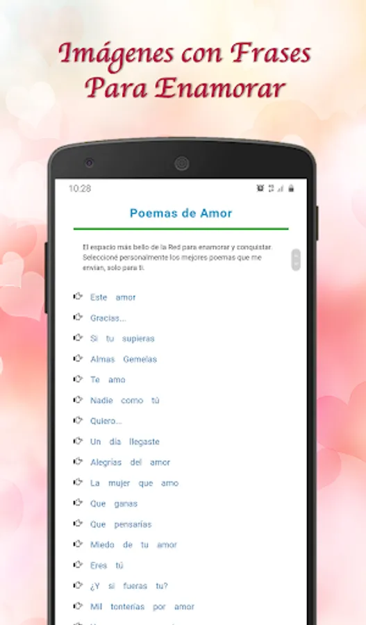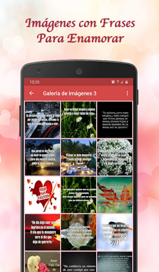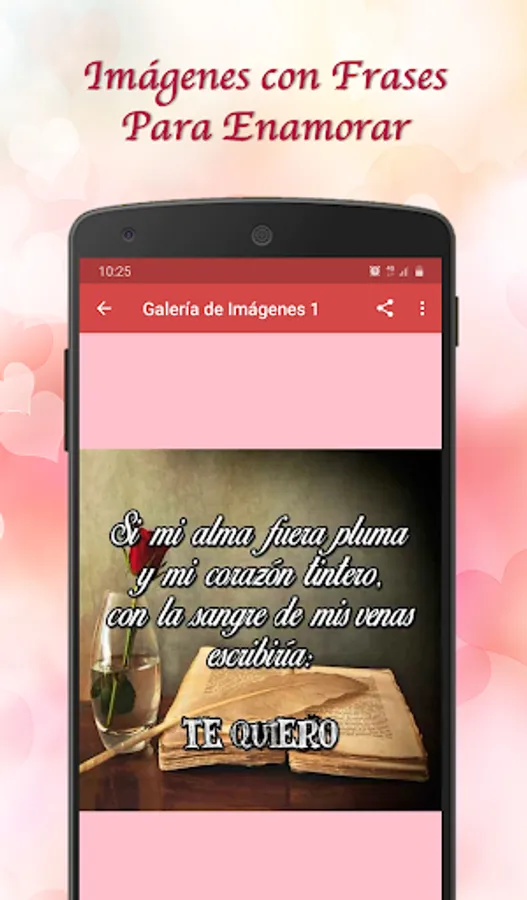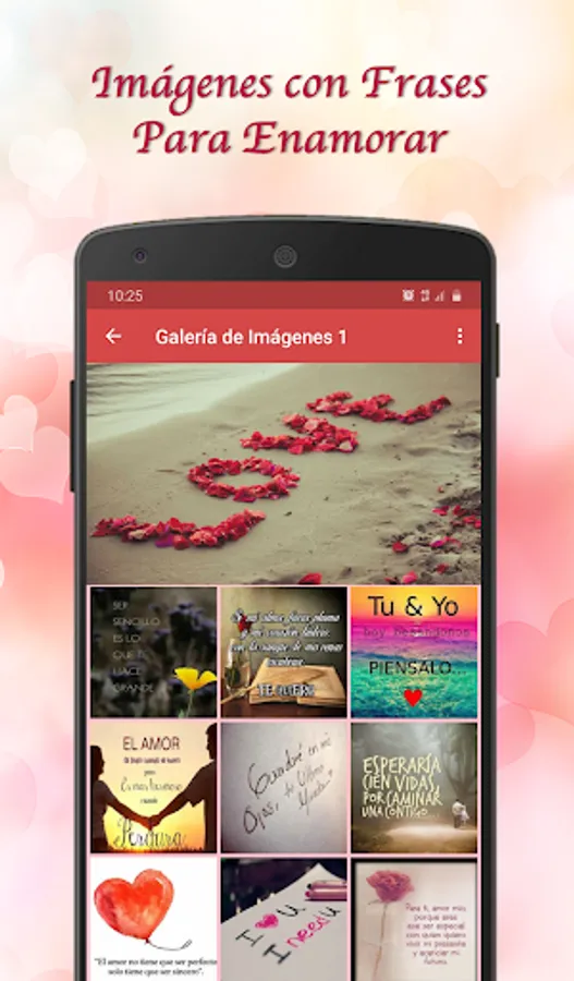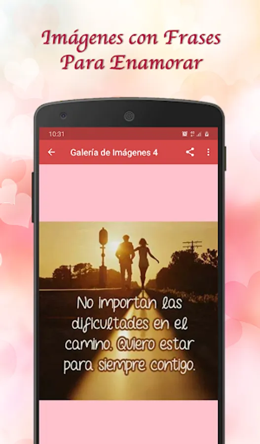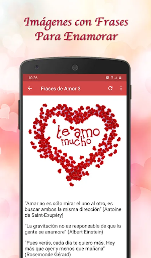 Sometimes it is difficult for us to express how in love we are and how to convey what we feel with phrases of love to conquer that person who has stolen our hearts, for this reason we share this application, Phrases to Fall in Love that will do much more easy to express everything you feel. You can find phrases to conquer and images to fall in love with which you can share with that person so important to you.