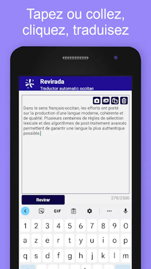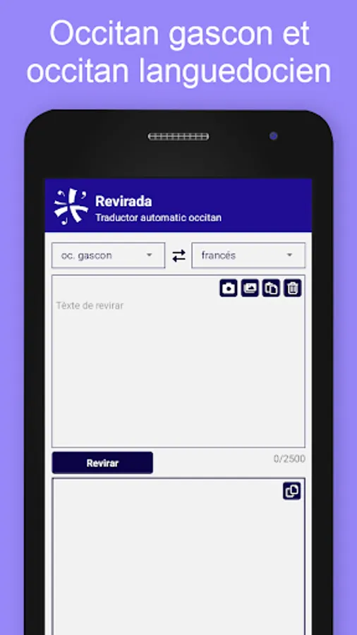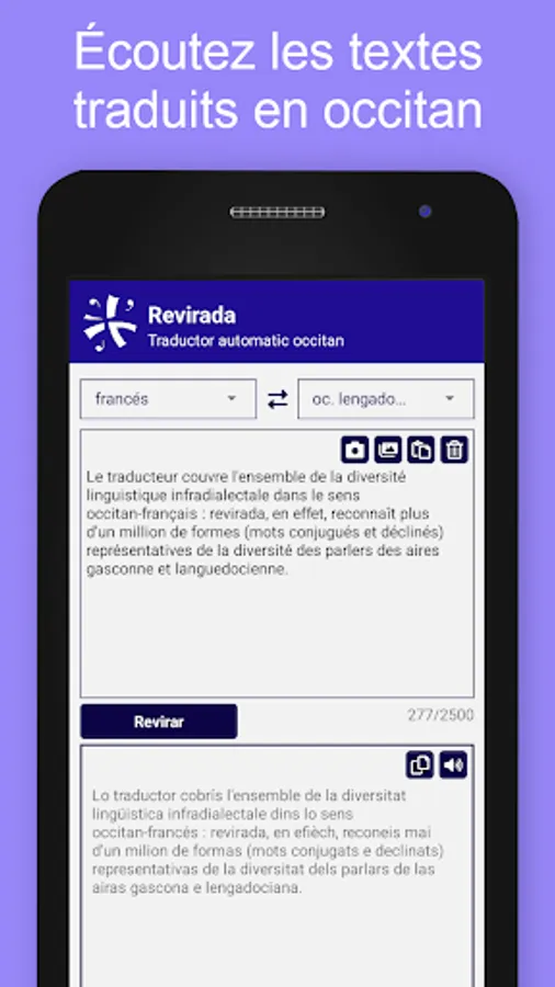 Type a text, paste it, import it from a photo or your gallery and translate it in one click. If the translation is in Occitan, you can even listen to it thanks to our vocal synthesis “votz”!