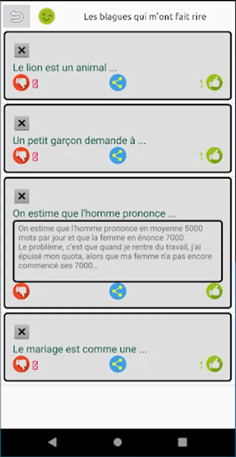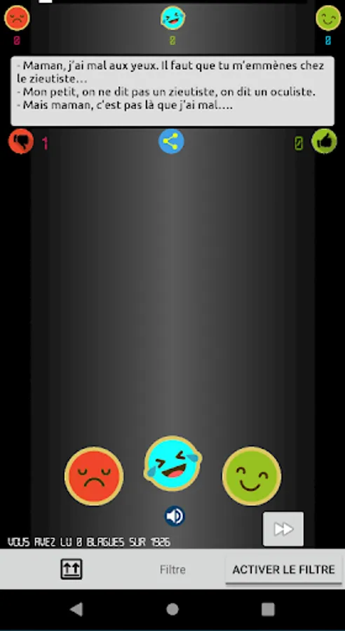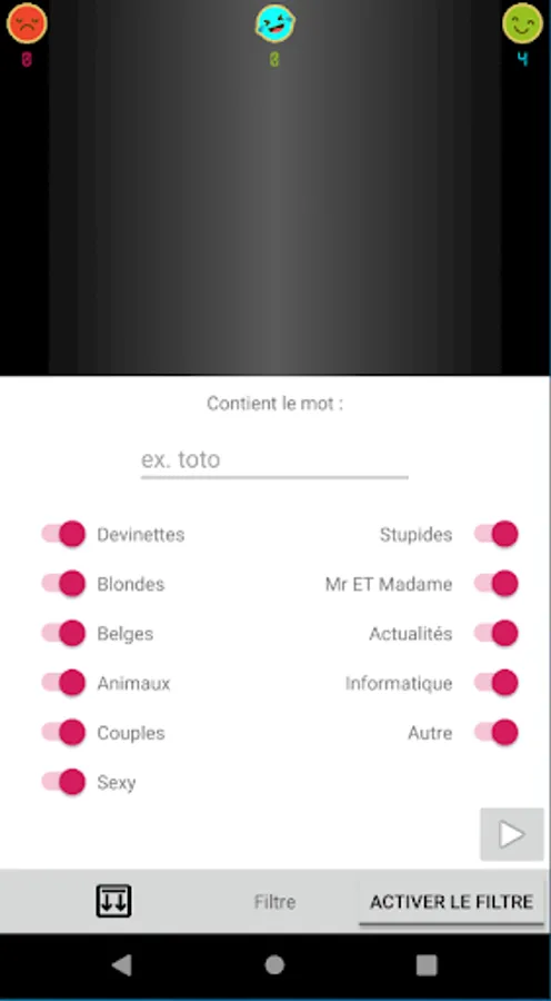 Choose your theme among the jokes of Monsieur and Madame, the jokes of blondes, the jokes of Belgians, the funny stories of animals, the jokes of Couples, Sexy, funny riddles, etc.