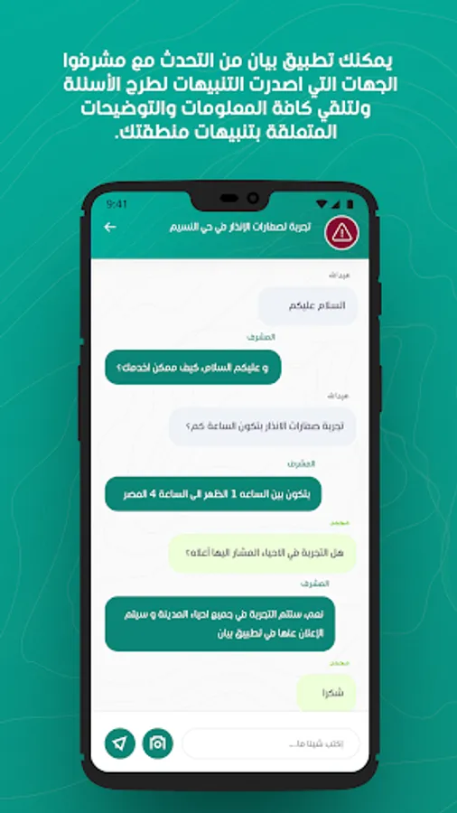 With the Bayan application, you will receive all information and alerts on your phone in the form of notifications. You can also speak with the supervisors of the bodies that issued the alerts to ask questions and to receive all information and clarifications