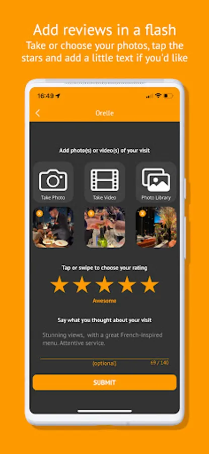 All you need to do to add a review is take or choose at least one photo or video, tap to set the rating, and add a short text review if you want to. Text reviews are optional, and limited to 140 characters, so you don't have to worry about writing an essay!