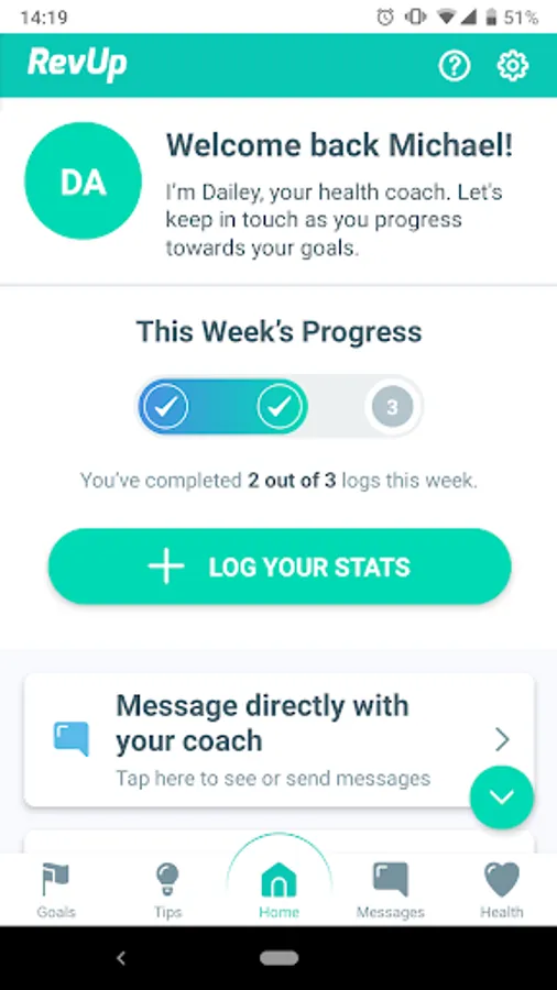 RevUp Care Management is a service provided by your doctor to help you better manage your health and stay connected between office visits. The RevUp app is a companion to this service that allows you to communicate with your health coach, set and track your health goals, and easily log your health vitals.