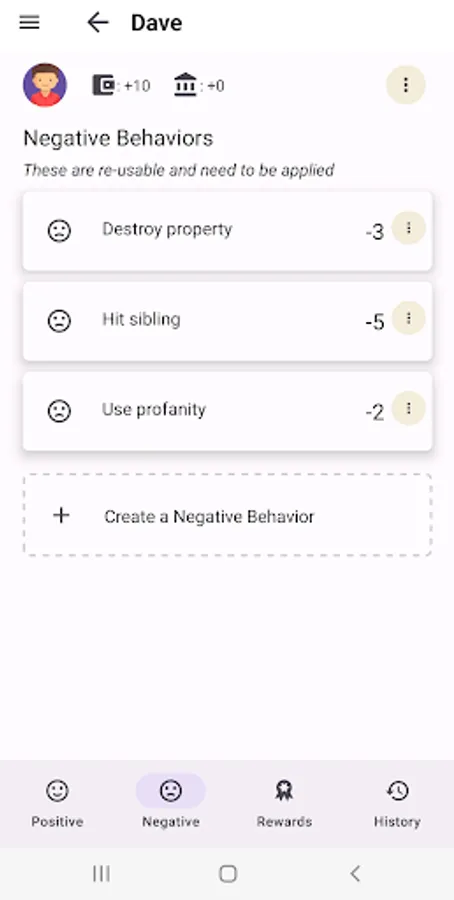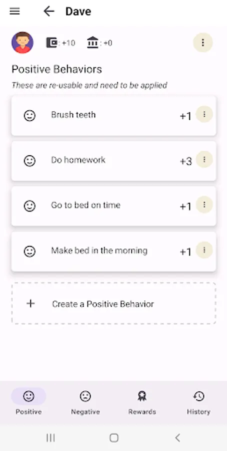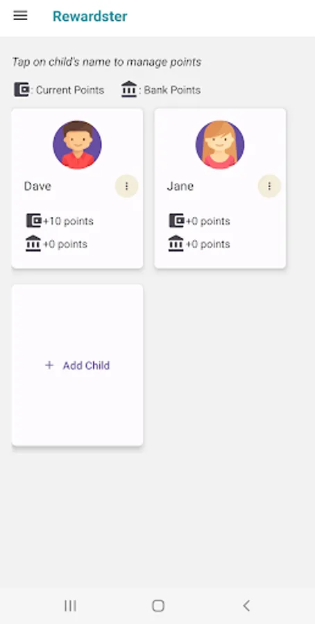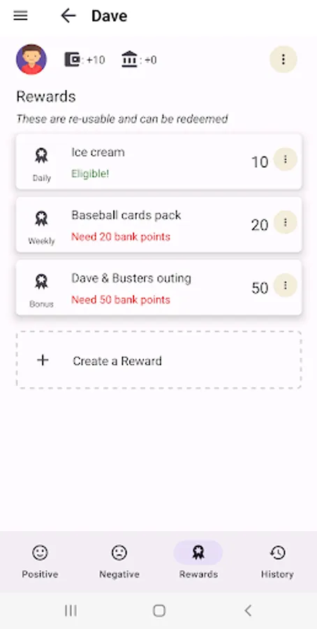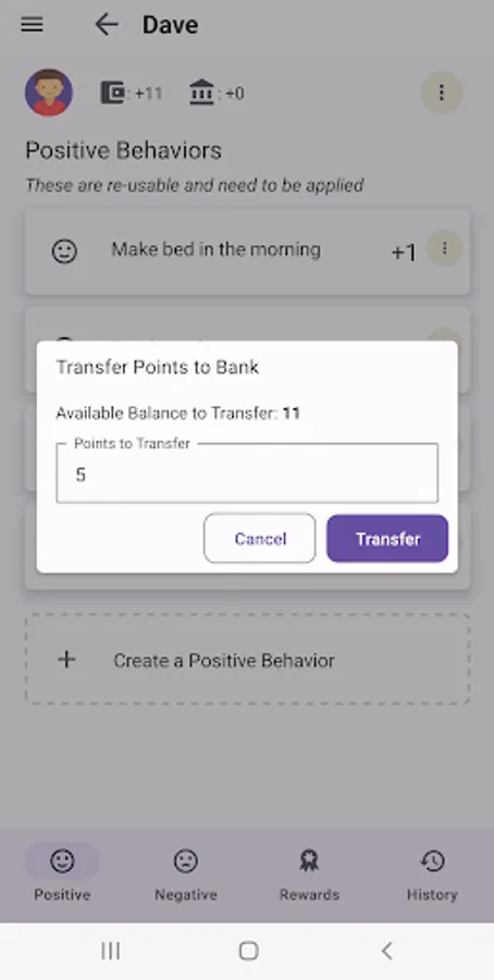 Accumulate points for your child by creating and tracking positive and negative behaviors. Redeem points for rewards. Transfer points into a bank to redeem for higher value rewards.