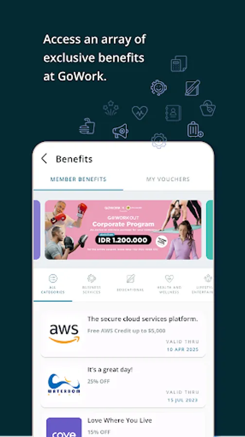 Get updates about benefits and perks available to you every day. Enjoy benefits from our partner businesses, from F&B outlets, e-commerce brands, and even cloud storage services! Moreover, enjoy discounts on GoWork products using vouchers!