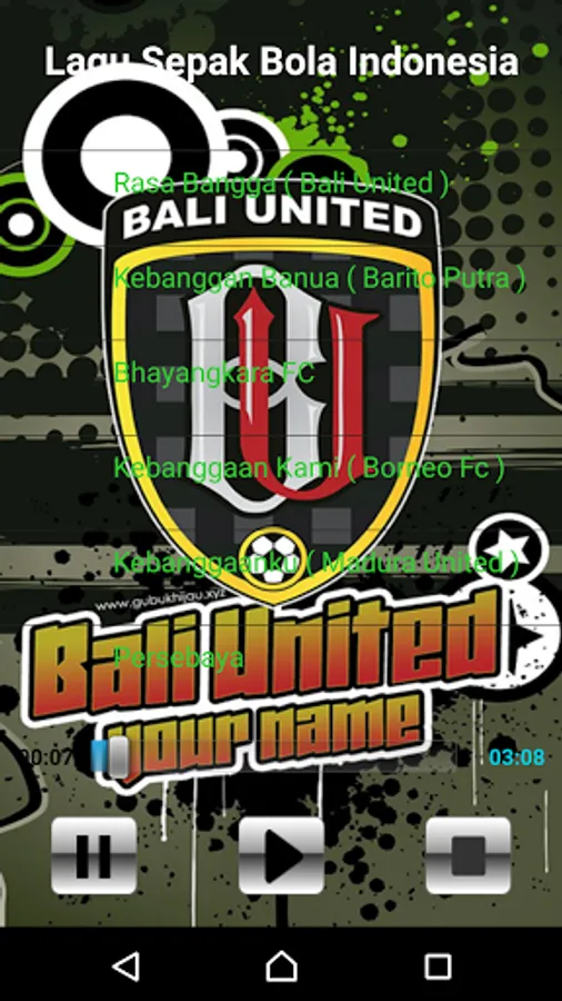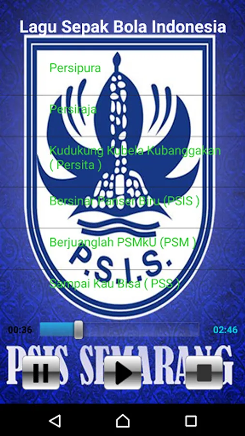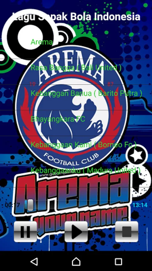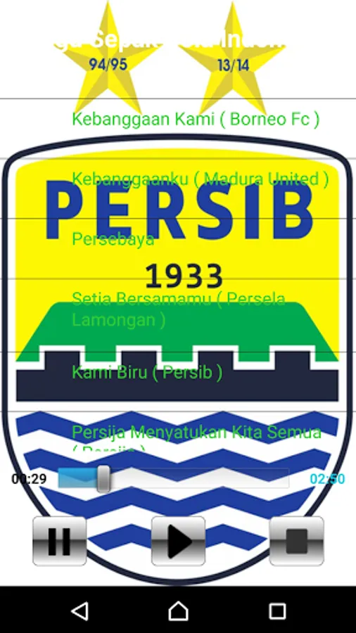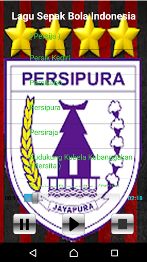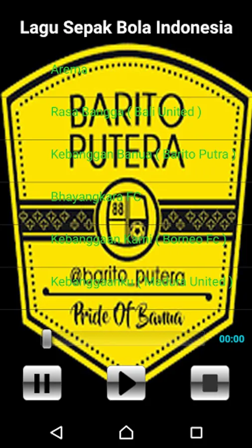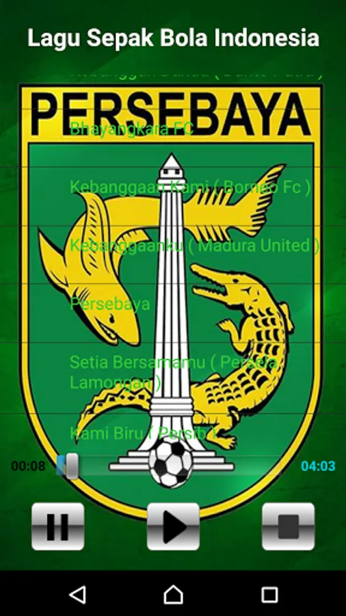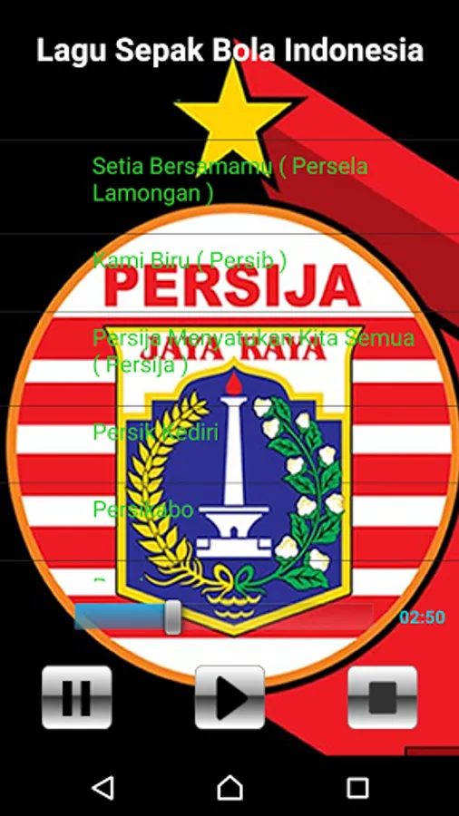 Indonesian football songs is a music player application that contains songs from Indonesian football clubs which are in the highest caste of national football which contain familiar clubs such as Arema, Persija, Persebaya, Persib, Persipura etc.