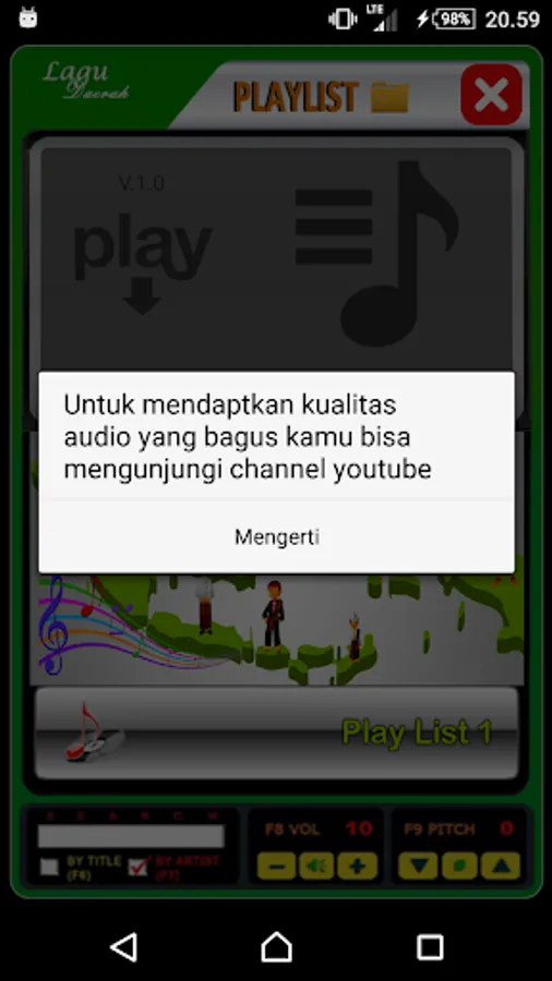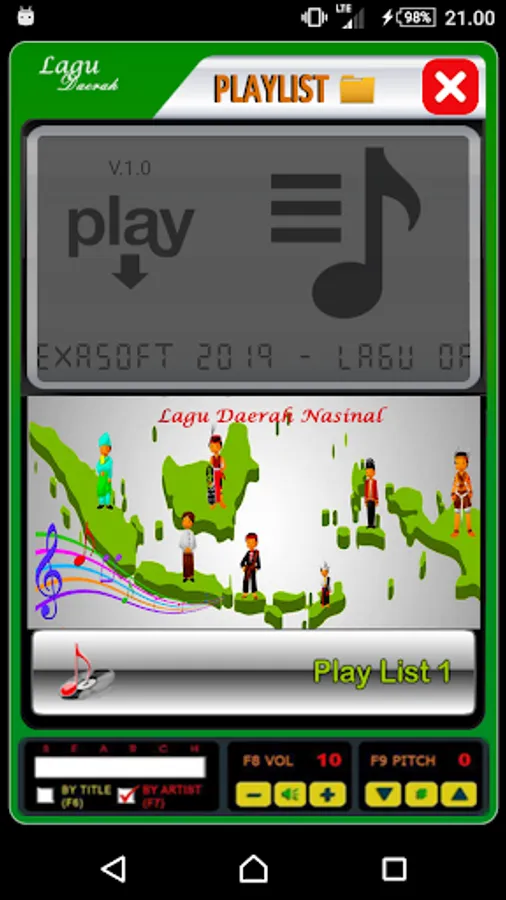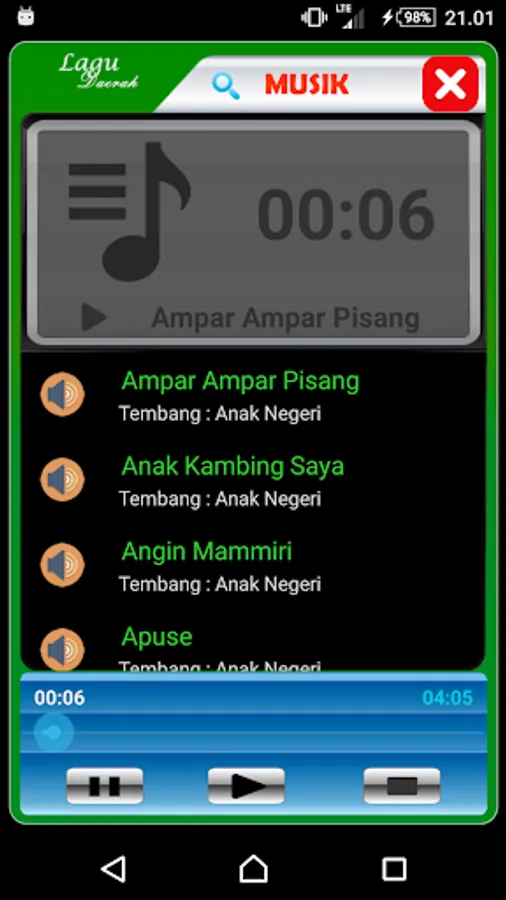 Indonesia is a Rich Country, including rich in culture. With thousands of islands, hundreds of regional languages, dance, as well as folk songs. From Sabang to Merauke all have folk songs. We present you with a music player application that contains regional songs in the archipelago in a clear mp3 format, attractive appearance and easy operation. Played offline so you don't waste your internet data.