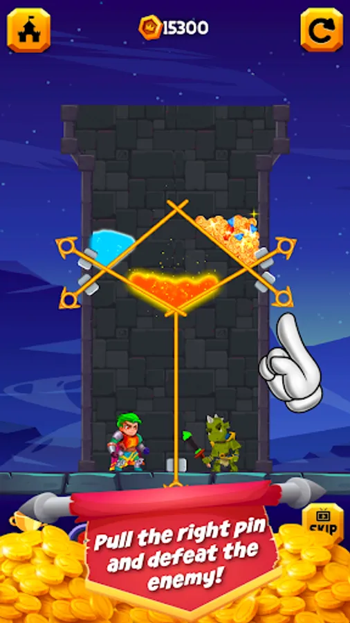Begin your journey and rescue the princess as you traverse through multiple deadly dungeons. Each level is filled with monsters willing to destroy you so you must be careful as you march. Pull the pins in the correct order and test your intelligence to outwit your enemies. Collect all the gems and gold treasures as you advance through this adventure. Use your new wealth to build your own kingdom. Select other elite warriors and use them in battle to continue the fight for the land!