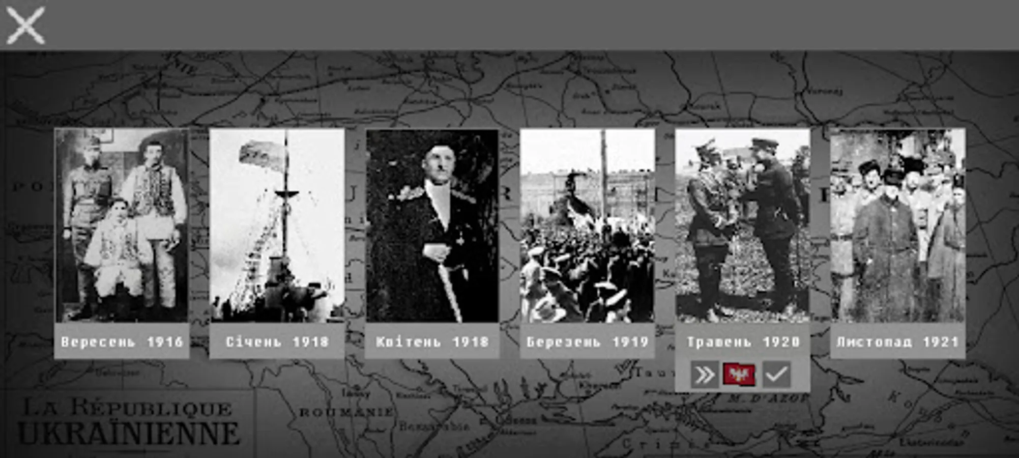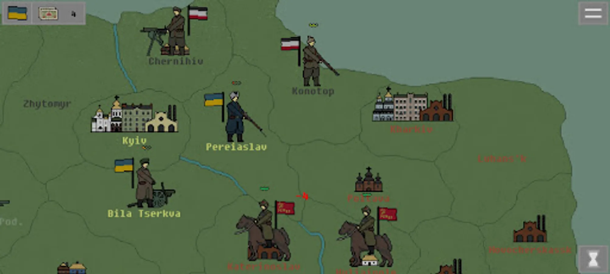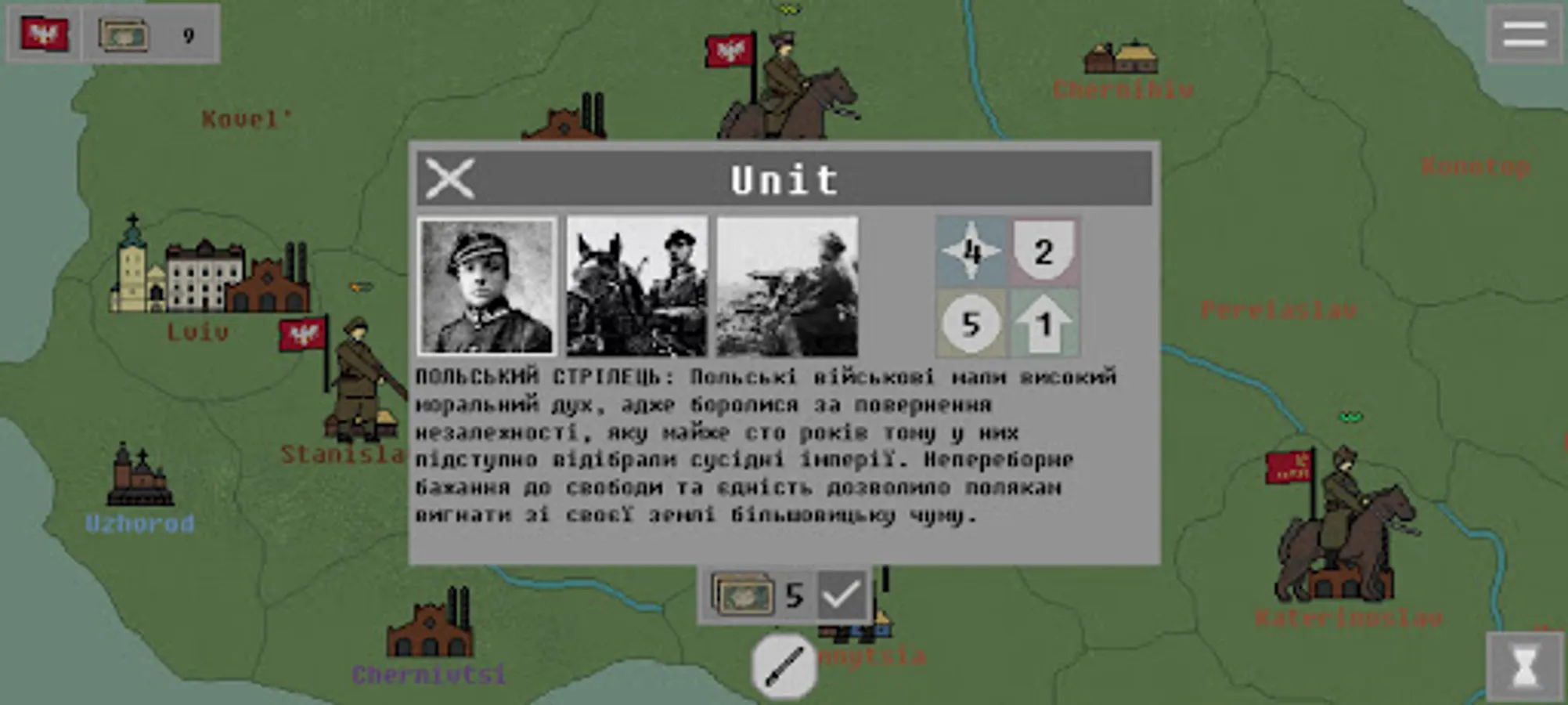 The player can play for the Ukrainian People's Republic, the Crimean Democratic Republic, Poland, the Anarchists, Austria-Hungary, and the German Empire. Each country in the game has its unique set of units with special characteristics (attack power, health, price, and the number of moves on the map per turn), which makes the game for different countries more diverse and interesting.
