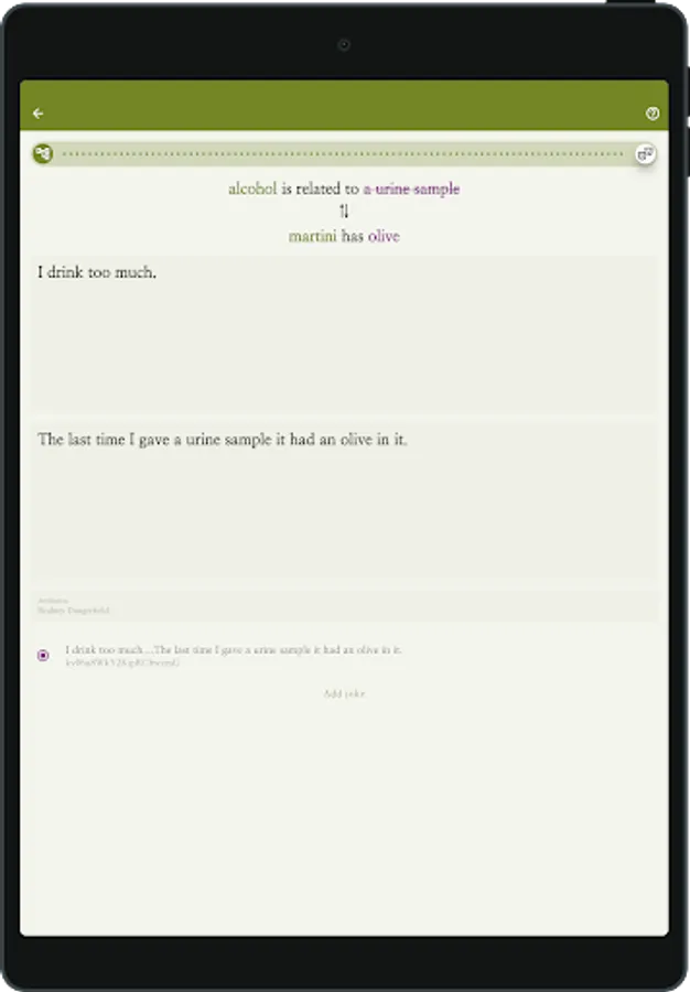 Jokes can easily manipulated, altered and copied to clipboard for quick sharing. Your jokes are also persisted offline and online through your Google, Apple (on Apple devices only) email or even anonymous account. With a variety of example jokes to browse (and more being added), it's easy to get going and writing your own.