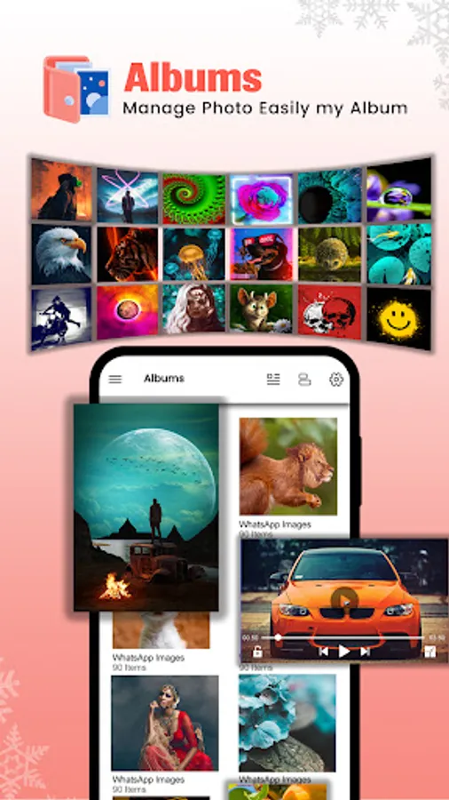App has an inbuilt photo viewer and video player. Manage your photos easily with albums. It runs smoothly even with thousands of pictures in an album or gallery.