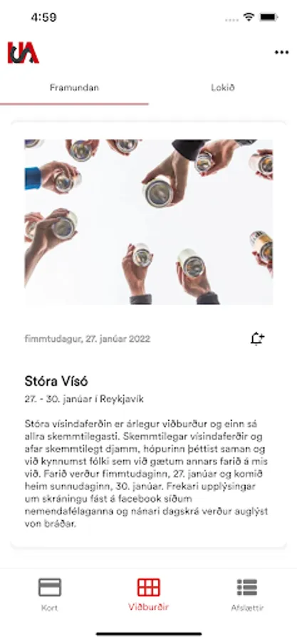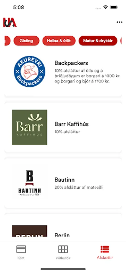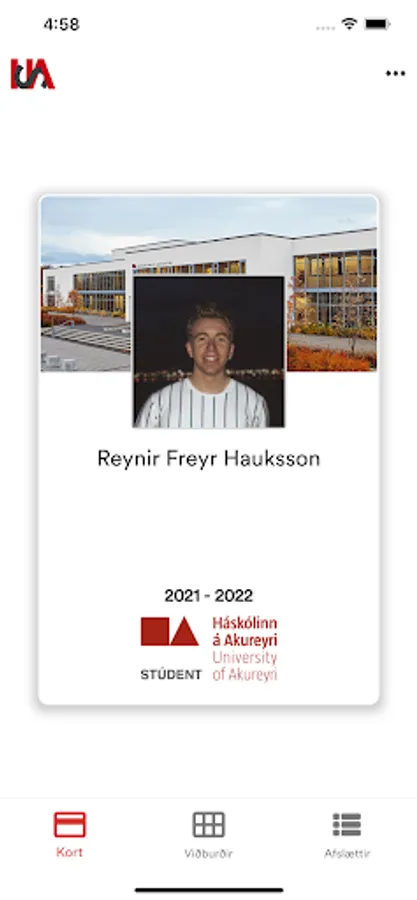 App for students at the University of Akureyri. In the app, you can retrieve a digital school id (card) that you can use as identification to get discounts. A list of discounts is provided in the app as well as a list of upcoming events so you can stay updated on the schools' social life.