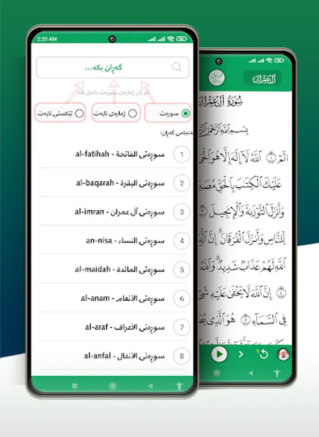 ئەتوانی لەکاتی سەیرکردنی قورئان گوێبیستی 35 قورئان خوێن بی لەگەڵ دەنگی تەفسیری کوردی زاراوەی سۆرانی و زاراوەی بادینی، بەرنامەی قورئانی پرۆز چەندین تایبەتمەندی لەخۆ دەگرێت بۆ بەکارهێنەر هندێک لەو تایبەت مەندیانە..📱👇🏾
