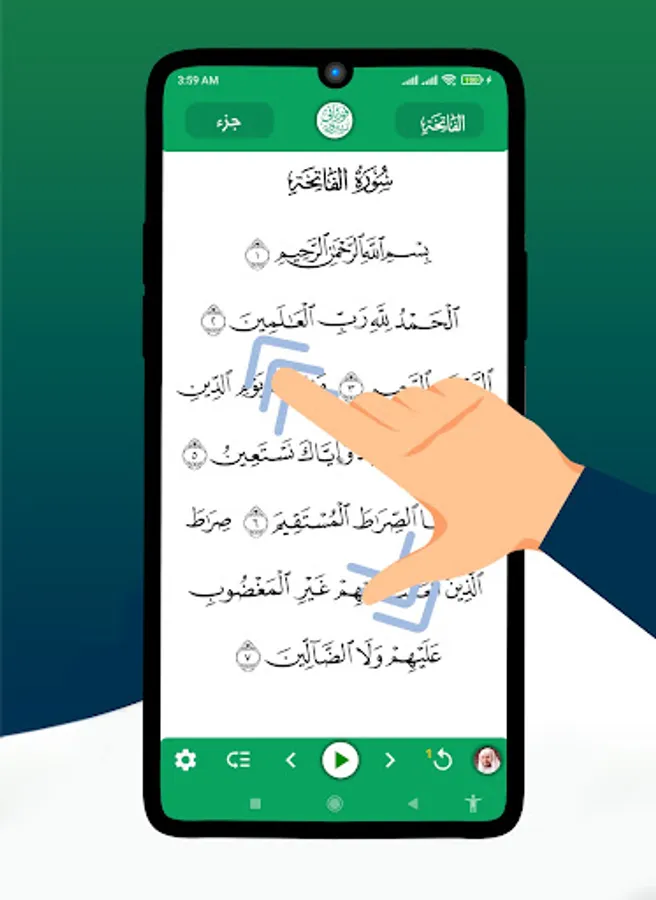 0------9 پەنچە داکرتن لەسەر شوێنی پێکردن بۆ هاتنە یەکەم ئایەتەوە