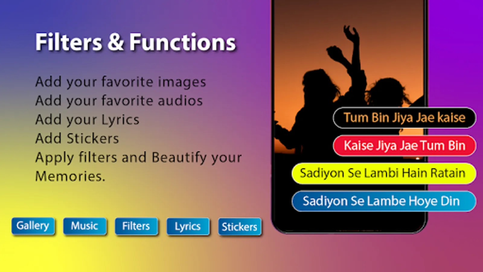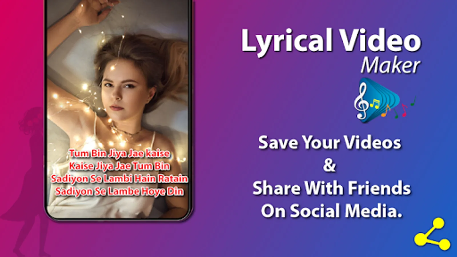 Lyrical Photo Video Maker with Music for Video Status.ly allows you to pick your favorite pictures and add your favorite song lyrics from collection of songs.