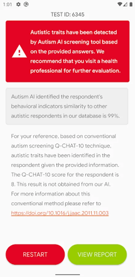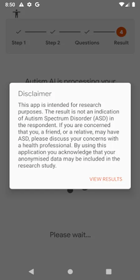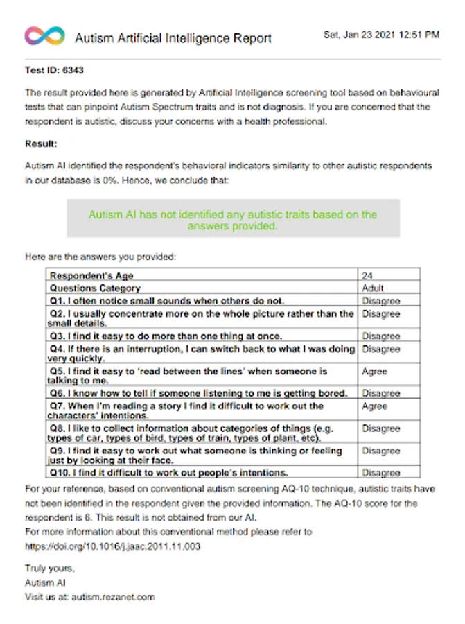 Please be noted that Autism AI is not a diagnostic tool and the results provided by this system is not an indication that the respondent is or isn't autistic.
