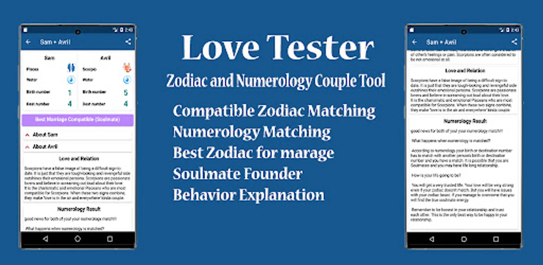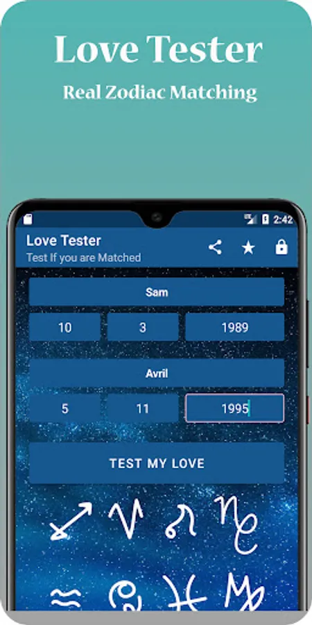 This app will not work if you don’t provide a proper date of birth. Love Tester only calculates two advanced calculations and lets you know if you are good for each other based on zodiac sign compatibility and numerology. If you or the other person have ego and anger issues then those calculations will fail. Respect, love, and trust for each other is very important in every relationship. If you are looking for a lifetime long relationship then both of you should be honest and should have a mind of sacrifice.