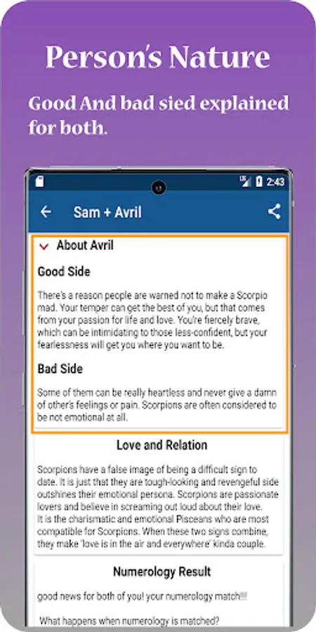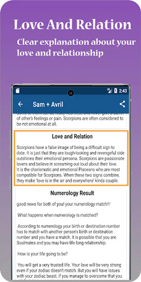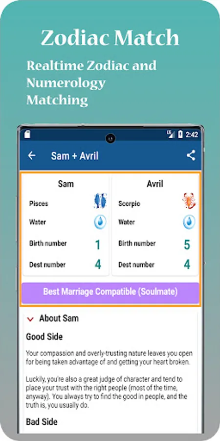 This app will ask yours and the others date of birth and name. By inserting that information and the app will calculate both people’s zodiac compatibility. It will also calculate their Numerology to check if you two are compatible or not.